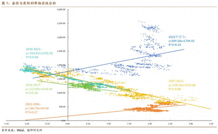 表面观测,金价与美元实际利率在过去的20余年里相关性有所波动。通过对金价以及美元实际利率的回归,可以看到:2003年-2015年间,金价对美元实际利率的敏感度为-404.8,解释力度为0.75;2016年-2019年间,金价对美元实际利率的敏感度为-151.3,解释力度为0.24;2020年至今,金价对美元实际利率的敏感度为224.1,解释力度为0.36。一方面是美元实际利率对金价的解释力度有所下滑,另一方面是在2020年至今这一区间中金价对美元实际利率出现了反直觉的正相关。二者均体现了金价在直接数据层面出现了与利率的脱钩。