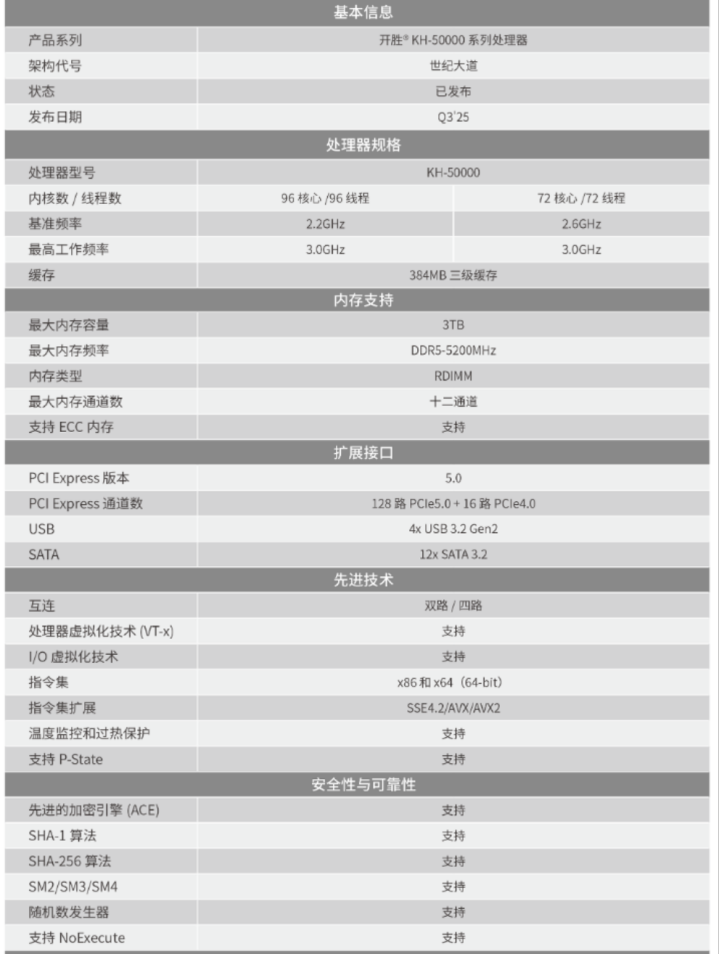 继在前几天的2025年云栖大会、中国国际通信展上芯片实物首秀之后, 29日,兆芯官网公布了开胜KH-50000系列处理器的更多规格细节,在祖国76华诞前夕献上了一份“科技贺礼“。KH-50000最高工作频率3.0GHz,分72核和96核两个规格版本,计算密度提升、IO接口和互连升级,一起来看看。
