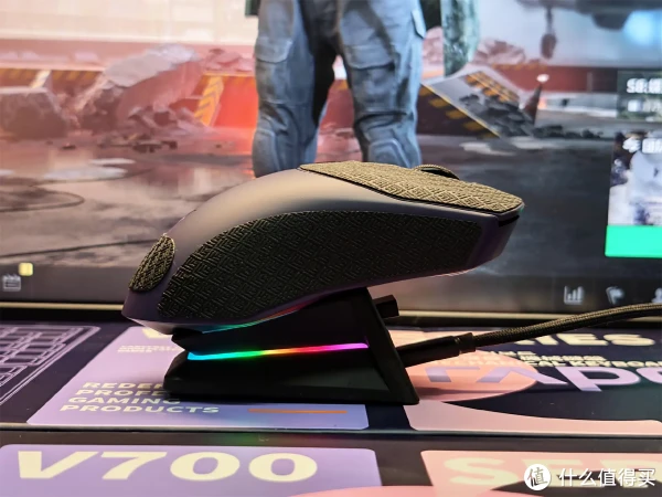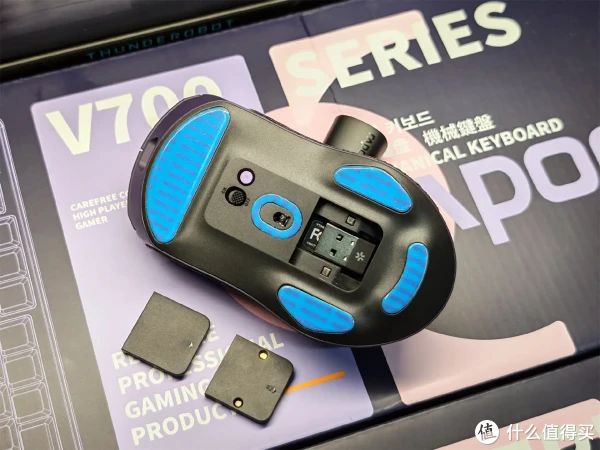 看底部设计,它延续了雷柏系列鼠标可互换配件的便捷特性,自家兼容性非常好。若家中已配备雷柏充电底座,无需繁琐插拔线材,只需将鼠标轻放于底座上即可完成充电,既省去了接线麻烦,酷炫的充电姿态也能兼顾实用性与颜值。
