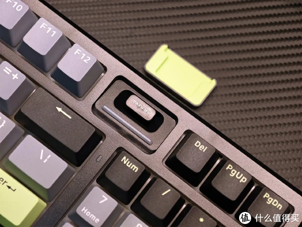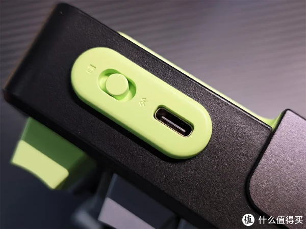 作为三模键盘,开关和充电(数据)接口设置在了左上方,拨动开关可以控制2.4G、有线、蓝牙模式,可快速切换5台设备,对于多设备用户比较实用。