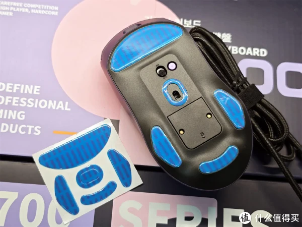 鼠标底部贴了5块特氟龙脚贴,覆盖面积大而且均匀,有效降低摩擦力,操作起来顺滑流畅且稳定。比某些鼠标5点式脚贴强太多。不挑鼠标垫,即便是平整桌面一样应对。