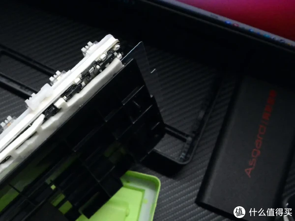 这款键盘的细节设计挺有意思,右上角的时空幻境仓搭配磁吸式铝合金盖板,磁吸开合,内置收纳空间用来收纳2.4G接收器,不仅不容易丢失更在侧边暗藏了多功能指示灯,兼具装饰感与实用价值,绿灯、黄灯、红灯直观呈现剩余电量,电量状态一目了然,兼顾颜值与实用性。