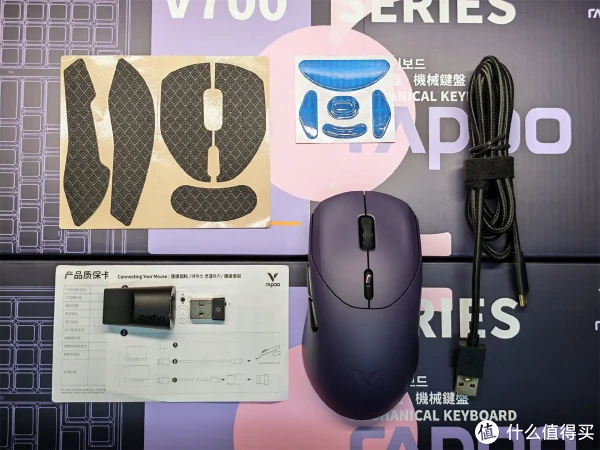 拆开包装,除鼠标主体外,8K版2.4G无线接收器、8K高速屏蔽传输数据线、USB转接器、防滑贴、备用脚贴及产品说明书一应俱全。数据线为编织材质做工扎实更耐用,与手机数据线接口一致,通用性不错。