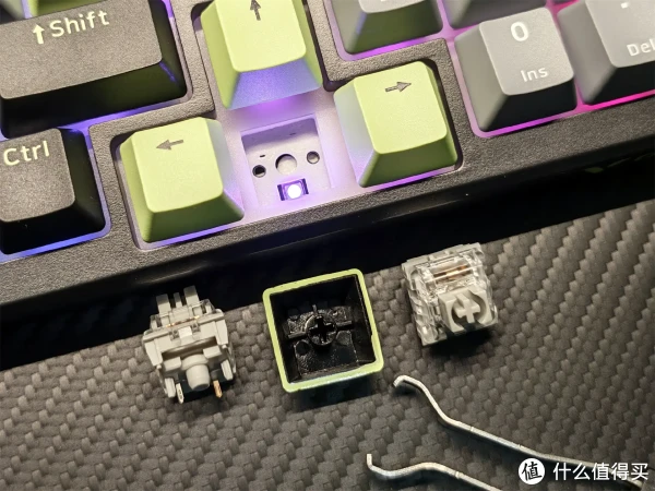 作为主打DIY的键盘,它搭载凯华热插拔轴座,可耐受5000次插拔,兼容市面主流5脚轴体,免焊接直插直换,搭配附赠的拔轴器旧可以用上了,新手一样轻松换。